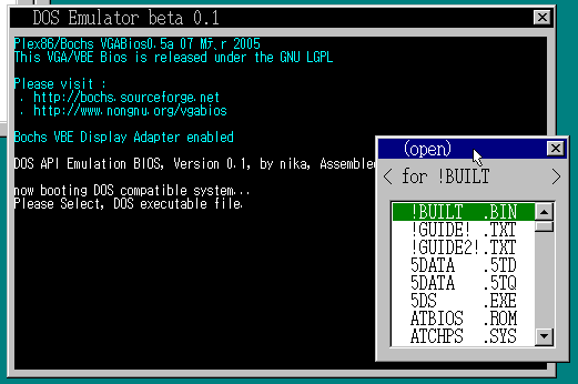 - もしかしたら今後はbochsの様な独自ハードウェア(I/O)でBIOSレベル(DOSが動作するレベル)での互換を採用したAT互換機のエミュレータに発展させるかもしれません(期待はしないで下さい)。 -- nika 2006/07/24 (月) 04:40:24